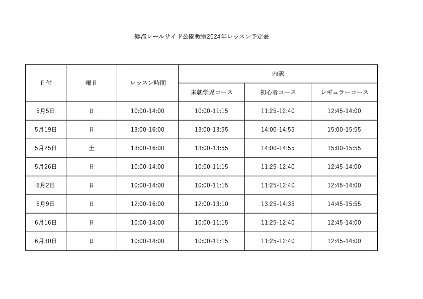 健都レールサイド公園教室レッスン予定表 2024 4/25 健都レールサイド公園教室では公園のイベント予定により一部レッスン日時変更の可能性があります。5月はイベントが多い事から通常より変更が多くあります。ご了承の程お願い致します。 関連 記事