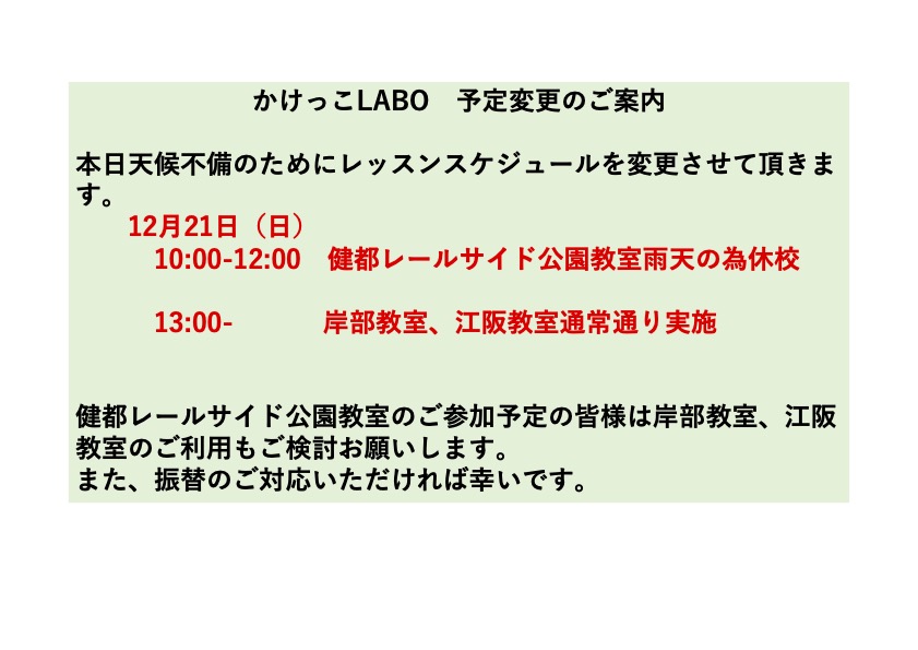 2025年12月21日健都レールサイド公演教室レッスン休止のお知らせ