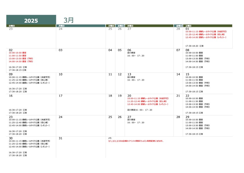 2025年3月レッスン予定表です。会場にてイベントがあるため一部予定変更があります。ご了承の程お願い致します。