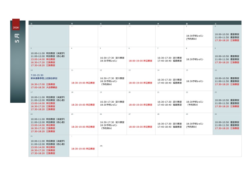 2026年5月度レッスンスケジュールに関し